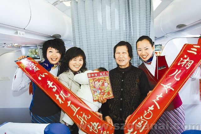 2007年2月9日9點36分,湘籍勞務工俠上愛心航玫,南航空姐為他們熱情服務。(王洪濤攝)