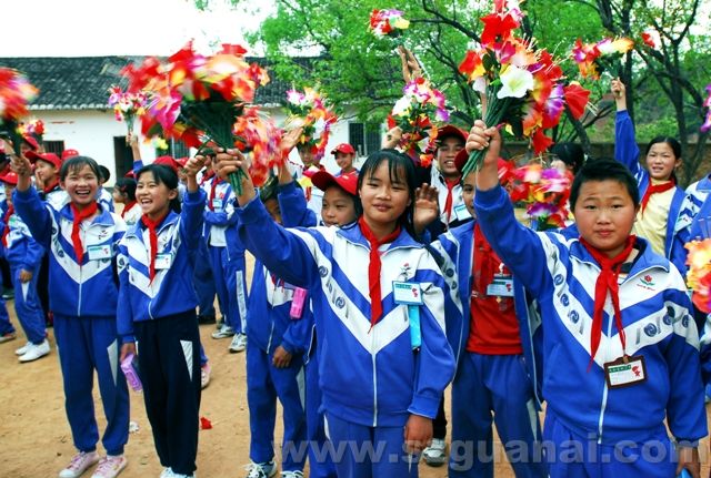 九和鎮官坑小學的同學們與實驗學校的同學們揮手告別(陳錦輝攝)