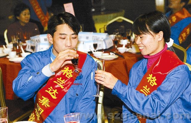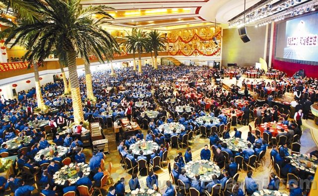 2007年2月3日中午時分,格蘭達2000多名勞務工走進五星級酒店與10多位全國政協委員同吃一道菜同唱一首歌。圖為2000多名勞務工享受著團圓飯。 ( 岑志利攝)