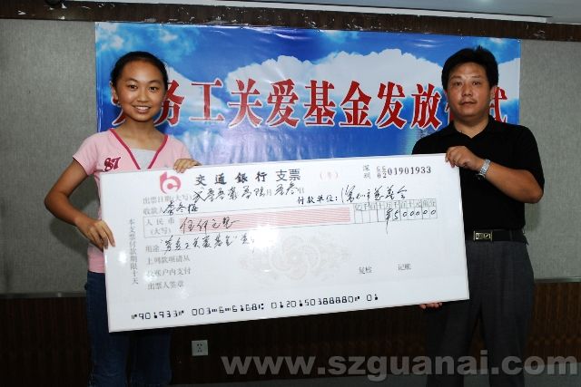 “慈善小天使”左沛鑫(左)為勞務工家屬發放關愛基金