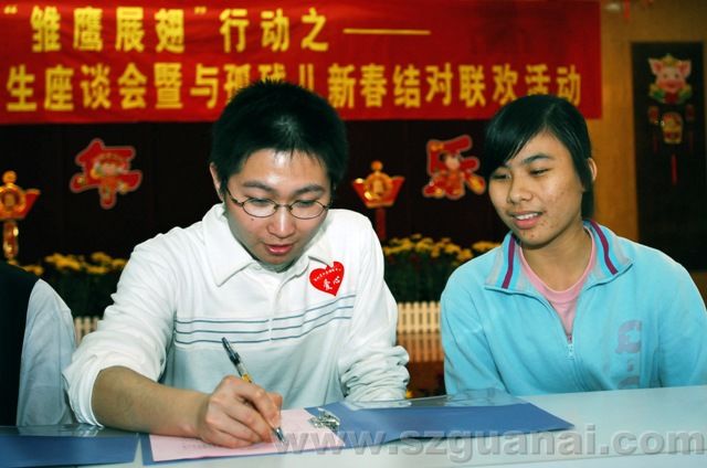 受助大學生(左)與福利中心孤兒簽訂結對協議書(陳錦輝攝)