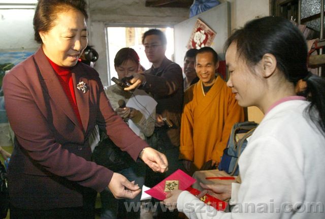 政協(xié)副主席姜忠和弘法寺工作人員看望寶安區(qū)光明街道翠湖社區(qū)陳耀輝一家。