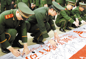 邊防官兵踴躍簽名獻(xiàn)愛心。 本報記者 許業(yè)周 攝 |