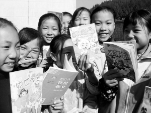 右圖:收到深圳孩子的捐書,貴州山區(qū)的孩子們十分開心。本報(bào)記者 彭晨攝