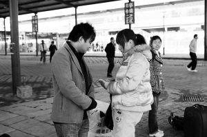 上午8時,售票點開門了,李波終于又看到希望??少I票的隊伍似乎過長,總也不往前挪動一下??吹嚼畈释难凵?,記者找到售票處經(jīng)理,向他反映了李波的情況,經(jīng)理當即保證李波的回家車票沒問題。10時30分,當李波接過K586次開往南充的火車座票時,眼圈有些泛紅。