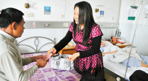 劉女士說,她聽說目前的醫藥費已經快到2萬元了,已欠了醫院2000多元錢。但她說剛才已問過院方了,收費單據還沒有打出來,要稍晚一些時候再交。這時,劉小花從包里拿出一個信封來,當面打開,把里面的錢遞給了阿金的養父王長壽先生。她說:“這里一共有2300元現金,是我的姐妹看了報紙后,擔心我生活有困難捐給我的,但我不需要,還是把這筆錢捐給阿金,因為除了醫藥費,她的養父母在醫院陪護也需要錢。”樸實的王長壽拉開床頭的抽屜,拿出黃婷小姐剛剛捐助的1000元錢告訴劉女士,說:“已經有好心人捐錢了,你不用太擔心。”