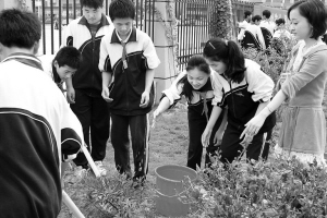 昨日,寶安區新湖中學的同學們親手種下一棵棵果樹,并把在校園里植樹的地方命名為“百果園”。小樹與同學們一同成長,為校園增添了一片新綠。 本報記者程海昆 通訊員 文建軍 攝