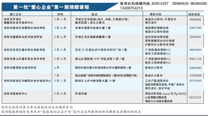由深圳晚報社、深圳市慈善會及深圳市慈善會·扶持中小企業(yè)共渡難關(guān)公益基金、深港產(chǎn)學(xué)研基地中小企業(yè)發(fā)展研究中心聯(lián)手發(fā)起的“2009深圳教育慈善行”暨“百萬勞務(wù)工公益培訓(xùn)計劃”啟動一個月以來社會反響強烈,不少市民前去參加由培訓(xùn)機構(gòu)提供的免費培訓(xùn)課程。