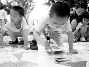 在陽光兒童樂園的操場上,記者看到,各區的小朋友紛紛拿出畫筆即興作畫,每個區都拿出自己最有特色的創意,大家分工合作共同畫出自己所在區的特色。有深圳標志性建筑物地王大廈、市民中心、賽格大廈,也有風景名勝青青世界、蓮花山公園……長長的畫布上呈現出孩子們心中多姿多彩的深圳全景圖。