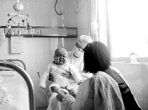 本報記者雷丹攝影報道 “旋旋,阿姨來看你了,你要堅強些,大家會想辦法幫你的!”昨天中午,愛心市民溫小姐再一次出現在小藝旋的病房前。自從本報6月19日刊出《一鍋熱粥燙傷11月齡男嬰》報道后,小藝旋的不幸遭遇就牽動了眾人的心,很多讀者向本報打來電話:小藝旋好些了嗎?近況如何?帶著讀者們的牽掛,記者于昨天到市第二人民醫院燒傷整形科重癥病房看望了小藝旋,意外發現被人親切地稱作“愛心爸爸”的竟然是本報的一位編輯。