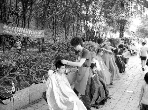 昨天,南山大道路邊,南山義工免費為市民理發(fā)。清水 攝