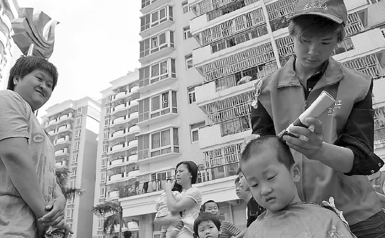 近日,西鄉(xiāng)義工身穿紅色義工馬甲,來到富華社區(qū),為老人小孩理發(fā)。這個小男孩享受著義工叔叔的手藝,愜意地瞇起眼睛。