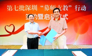 (本網(wǎng)訊) 6月23日,第七批深圳“募師支教”行動(dòng)簽約暨啟動(dòng)儀式在深舉行,深圳市關(guān)愛(ài)辦主任、深圳報(bào)業(yè)集團(tuán)黨組書(shū)記、社長(zhǎng)黃揚(yáng)略代表主辦方,與贊助方深圳中航集團(tuán)股份有限公司董事長(zhǎng)吳光權(quán)正式簽署《深圳市第七批“募師支教”公益合作協(xié)議書(shū)》,標(biāo)志著深圳關(guān)愛(ài)行動(dòng)品牌項(xiàng)目——“募師支教”再次啟動(dòng)。由深圳中航集團(tuán)出資100萬(wàn)元人民幣、獨(dú)家贊助的第七批“募師支教”行動(dòng),從即日起面向全國(guó)公開(kāi)招募80名支教志愿者,他們將分赴甘肅隴南、江西井岡山和廣西等地的山區(qū)學(xué)校,支教一個(gè)學(xué)期。深圳報(bào)業(yè)集團(tuán)副總編、深圳商報(bào)副總編李南玲主持了“募師支教”行動(dòng)簽約儀式。