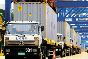 工作人員指揮裝滿活動板房的貨柜裝船。