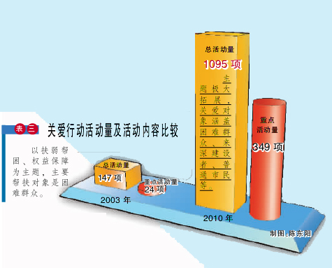 首屆深圳關愛行動開始后6年多來,深圳關愛行動共舉辦9000多項愛心活動,吸引上千萬人次熱情參與。而上月拉開溫馨大幕的第七屆關愛行動的項目達到了歷屆之最,有1000多項。7年來,深圳關愛行動共舉辦愛心活動超過10000項。其中,2010年的活動總量比2003年首屆關愛行動的活動總量增長了7.5倍;重點活動項目則增長了14倍,內容從較為單一的扶弱助貧拓展到對各個人群的關愛(見表三)。