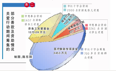 據不完全統計,在深圳關愛行動期間,設在市慈善會、市紅十字會及深圳關愛行動組委會辦公室的三大愛心賬戶,先后募集善款超過21億元,其中深圳市慈善會募捐超過16億元,深圳市紅十字會募捐4億多元,深圳關愛賬戶募捐8000多萬元。這些愛心善款溫暖了深圳的困難群眾,溫暖了來自祖國各地的來深建設者,溫暖了四川、隴南地震災區的人們,溫暖了臺灣遭遇風災的同胞。善款帶著深圳人的愛心流向千家萬戶,受惠群眾超過一億人。更為可喜的是,我市對困難群體的關愛,已經形成了長效機制,眾多困難群體獲得了救助。(見表二)