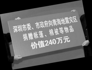 “青海玉樹地震的消息傳來后,深圳廣大黨員、干部和群眾心急如焚。”在捐贈儀式上,白天說,“深圳是全國人民支援建設起來的深圳,各級各部門要把此次支援青海玉樹地區的工作作為特區成立30周年的一次特別行動,積極組織和開展好捐贈和支援活動。”