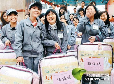 寶安區新安街道某工業區的青工們昨日欣喜地收到街道辦送來的關愛棉被。 記者 邱海彬