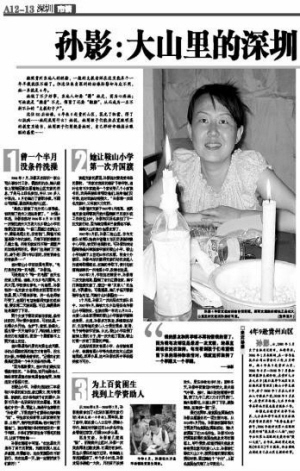 深圳市委市政府近日下發了《關于開展向孫影同志學習活動的決定》。決定指出,深圳經濟特區建立30年來,我市廣大干部群眾積極投身改革開放和現代化建設的宏偉事業,產生了“感恩改革開放,回報全國人民”的深厚情感,形成了“團結互助、扶貧濟困”的關愛精神,涌現出一大批幫困助弱、樂于奉獻的愛心市民。深圳關愛行動“募師支教”項目志愿者孫影,是其中的杰出代表。