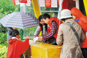 大年初一早上,雖然深圳的氣溫讓人覺得有些刺骨,飄下的細(xì)雨也有些讓人措手不及,但是依舊阻擋不了市民出游的好心情。在世界之窗景區(qū)正門口,全新的裝扮讓人感受到濃濃春意,游人摩肩接踵。大批興致勃勃的游人也“忙壞”了世界之窗U站的義工們。20多名文明勸導(dǎo)義工分成兩隊(duì),在世界之窗人流量大的人行路口進(jìn)行交通引導(dǎo),紅色的馬甲在人群中分外顯眼。U站推出了許愿漂流瓶、對口扶貧募捐等服務(wù)內(nèi)容,在U站里,義工們忙著吹氣球,把扎好的氣球?qū)懮献8UZ送給往來的游客。在這群“紅馬甲”當(dāng)中,義工們發(fā)現(xiàn)一個熟悉的身影,原來團(tuán)市委書記張志華大年初一也來參加義工服務(wù)了。U站站長莊進(jìn)說:“沒想到書記大年初一就來和我們一起做義工,太給力了!”