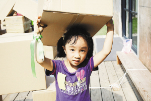 小姑娘背起紙箱子,準備搭建她心中的城市。