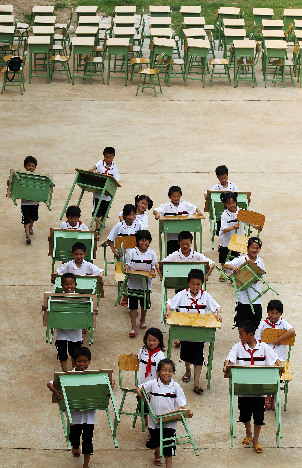 孩子們自告奮勇,動手將新書桌搬進課室。