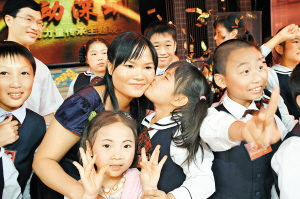 地貧兒親吻“花姐姐”。2005年,24歲的陳錦花將2歲的“地貧兒”浩浩領回家,當起了“未婚媽媽”。