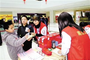 余振芳(右一)為孤殘兒童募捐。 深圳晚報記者 馬琳潔 曾賢平攝