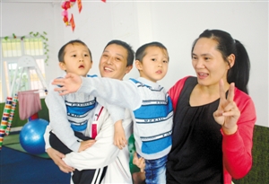 康復(fù)中心建立之后,徐維初就將自己的孩子帶進(jìn)來(lái)做康復(fù)。如今,孩子能蹦能跳,兄弟倆也開(kāi)始主動(dòng)找人玩,正在一步步好轉(zhuǎn)。昨天,記者在康復(fù)中心一樓訓(xùn)練室看到,徐維初的雙胞胎兒子在老師的指導(dǎo)下玩游戲、盡情地蹦跳,“看到他們和其他的孩子都在慢慢在恢復(fù),再多的付出也值得了。”那一刻,徐維初很滿足。