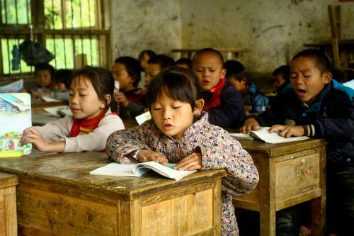 孩子們在簡陋的教室里大聲讀書