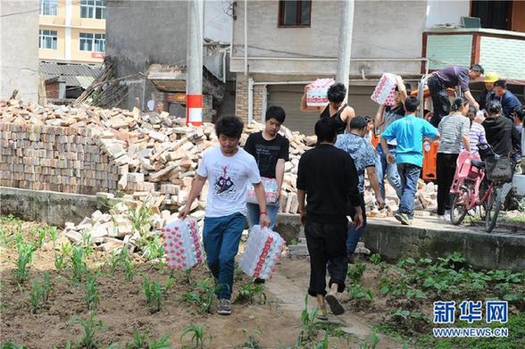 4月20日,蘆山縣城城西社區(qū)居民領(lǐng)取政府提供的礦泉水。當(dāng)日,四川雅安蘆山縣發(fā)生7.0級(jí)地震。其中蘆山縣的龍門鄉(xiāng)、寶盛鄉(xiāng)、太平鎮(zhèn)三地受災(zāi)最為嚴(yán)重。新華社記者 金小明 攝