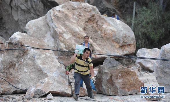 4月20日,寶盛鄉群眾在運送礦泉水。當日,四川雅安蘆山縣發生7.0級地震。其中蘆山縣的龍門鄉、寶盛鄉、太平鎮三地受災最為嚴重。新華社記者 江宏景 攝