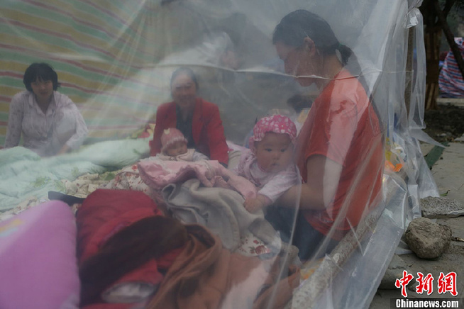 21日傍晚,寶興縣城的寶興河邊,一戶人家用透明塑料膜制成帳篷。許云峰 攝