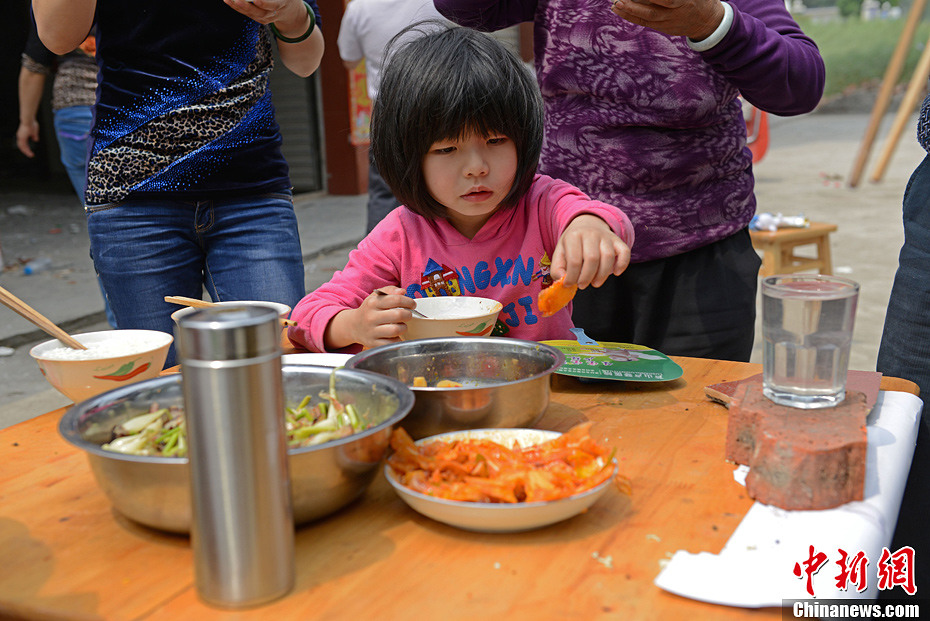 4月21日下午2點,蘆山縣龍門鄉75歲的村民傅玉潤一家,地震以來第一次吃上了大米飯。從4月20日地震發生以來,傅玉潤家都是吃的方便面和餅干,今天利用自家地里的菜和受損房間里的米做了一餐飯菜。中新社發張元 攝