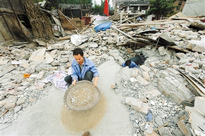 昨天上午,蘆山縣龍門鄉(xiāng)古城村月光山村民小組的駱大孝在自家屋子的廢墟上用篩子篩谷子,他的妻子則在倒塌的廢墟里一點(diǎn)一點(diǎn)的往外掏谷子。