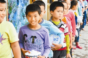 “第一次吃到新廚房的飯菜時,好香,還有肉,我吃了一份還想吃!”13歲的五年級學生班明朝告訴記者,“我爸媽都在廣東打工。以前我要從家里背米來,還有柴”,老師幫他蒸飯,再澆上一點白菜或豆腐湯,就算一頓午飯。家里貧困的同學午餐有的吃玉米粥,還有的天天吃黃豆蒸飯。