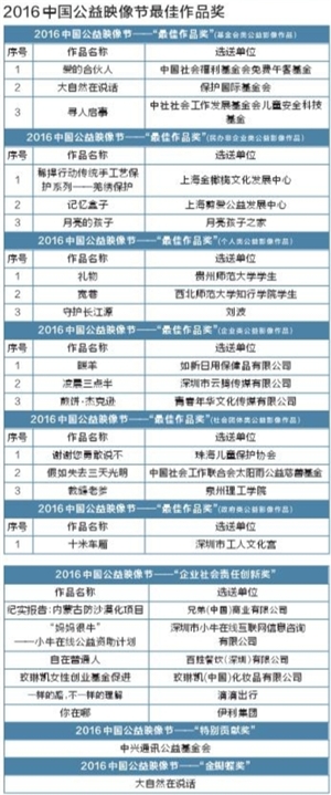 在主持人楊錦麟、劉茗茗的動人串講下,2016中國公益映像節(jié)頒獎盛典現(xiàn)場揭曉了2016中國公益映像節(jié)最佳單項獎、最佳作品獎、企業(yè)社會責任創(chuàng)新獎以及最高獎項金蝴蝶獎等獎項,20部影片在頒獎典禮大放光彩。中興通訊公益基金摘得特別貢獻獎。中興通訊副總裁、中興通訊公益基金會秘書長何雪梅表示,中興堅持關(guān)愛滇西抗戰(zhàn)老兵的公益計劃已經(jīng)十一年。老兵們代表的是我們所崇敬的精神,這是公益在傳播愛與溫暖中所表達的一種推動的力量。
