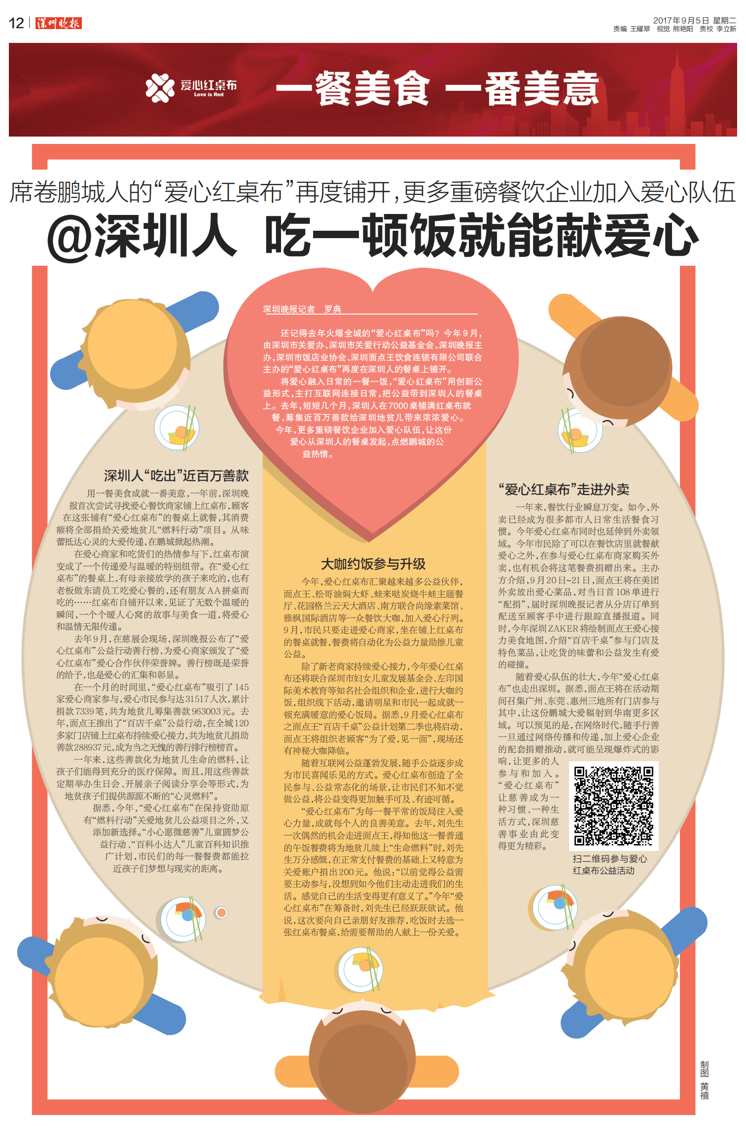 還記得去年火爆全城的“愛心紅桌布”嗎?今年9月,由深圳市關愛辦、深圳市關愛行動公益基金會、深圳晚報主辦,深圳市飯店業協會、深圳面點王飲食連鎖有限公司聯合主辦的“愛心紅桌布”再度在深圳人的餐桌上鋪開。