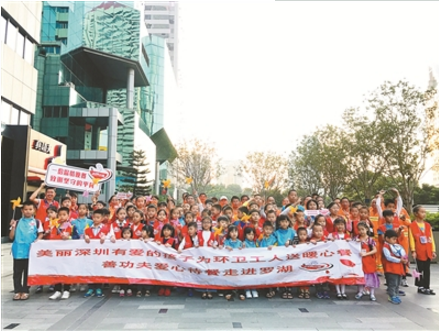 “環(huán)衛(wèi)工人為城市的美麗整潔默默奉獻(xiàn),他們工作苦累、薪酬有限、吃飯不定時(shí)、無(wú)法顧及營(yíng)養(yǎng)問(wèn)題,在他們屬于他們的節(jié)日里,讓我們?yōu)樗麄兯蜕弦活D暖餐,感謝城市美容師!”活動(dòng)現(xiàn)場(chǎng),深圳晚報(bào)親子志愿者團(tuán)羅湖分部管理員羅潔純向小志愿者們講述活動(dòng)的意義,并聯(lián)合羅湖區(qū)美麗深圳文明大使向環(huán)衛(wèi)工人表示敬意。同時(shí),親子志愿者團(tuán)的志愿者們將此前義賣報(bào)紙所籌善款購(gòu)買了米、油等慰問(wèn)品,一并送到環(huán)衛(wèi)工人手中,多才多藝的孩子也為環(huán)衛(wèi)工人帶來(lái)了精彩的才藝表演。