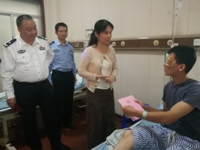 深圳晚報訊(記者 羅典)躺在病床上丁力和薛昭協接過慰問金,身上的繃帶,掩蓋不了他們工作熱情,兩位輔警都是在執行任務的時候負傷,如今正在深圳華僑醫院治療。9 日下午,深圳市交警局、深圳市關愛辦以及民生銀行深圳市分行一行帶著鮮花來到病床前看望受傷輔警,送上慰問金,囑咐他們好好養病保重身體。