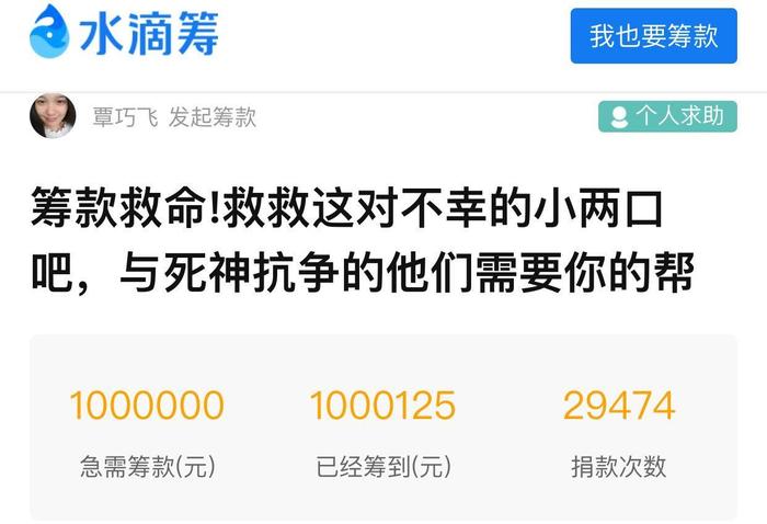 2018 年5 月17 日晚8 點,羅湖一出租屋因煤氣泄漏引發爆炸,屋內一對年輕情侶被嚴重燒傷至“體無完膚”,送往醫院重癥室接受治療。面對至少300 萬元的高昂費用,來自農村的雙方家庭都愁壞了。22 日,一位名為“覃巧飛”的網友在網上發起了100 萬元的眾籌,短短10 個小時,參與眾籌的網友超過2.9 萬人次,眾籌目標順利完成,家屬得知后連聲表示感謝。
