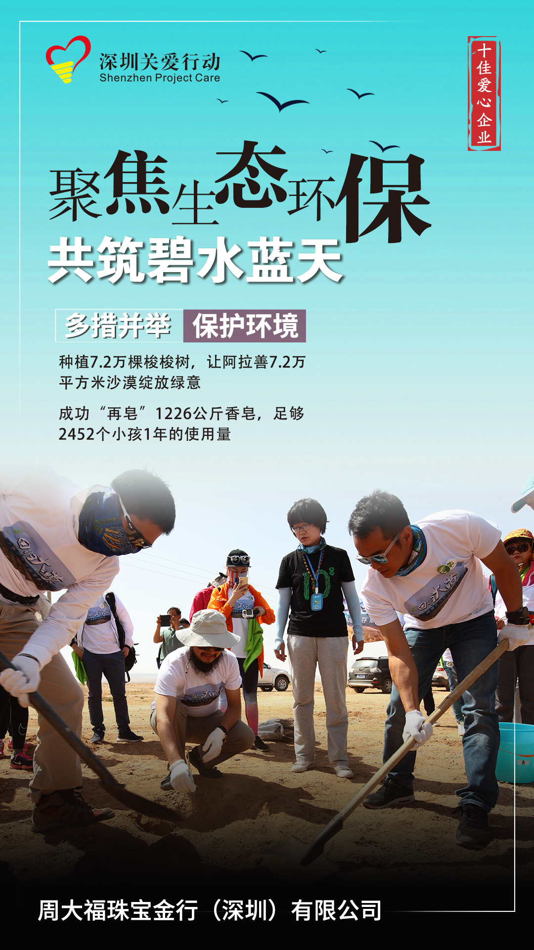 周大福珠寶金行(深圳)有限公司于2016年與阿拉善SEE基金會合作,5年間在阿拉善種植超過7.2萬棵梭梭樹,覆蓋超過72000平方米的沙漠,為阿拉善增添了一抹綠;通過利用回收及再造未消耗的肥皂進行“再皂”,成功再皂1226公斤香皂,足夠2452個小孩1年的使用量。
