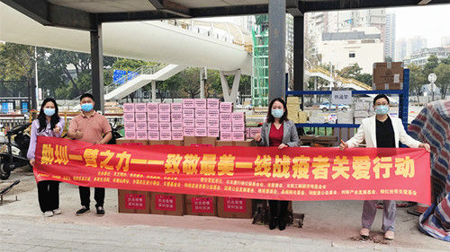 深圳市關愛行動公益基金會迅速行動,聯合公益伙伴、愛心企業迅速籌集關愛物資。本來生活網捐贈一批食品、飲料和飲用水。深圳市潮汕商會聯合廣州泓景堂醫藥有限公司捐贈了800箱金銀花保健涼茶。關愛基金會·粉紅絲帶關愛基金捐贈了2000瓶抑菌洗手液,關愛基金會·創新產業發展基金捐贈了食品和飲用水。這批關愛物資在深圳市職工解困濟難基金會和福田區總工會的支持下,迅速送達福田區福保街道,由街道工會負責安排志愿者為一線抗疫人員送去生活物資和健康關愛。