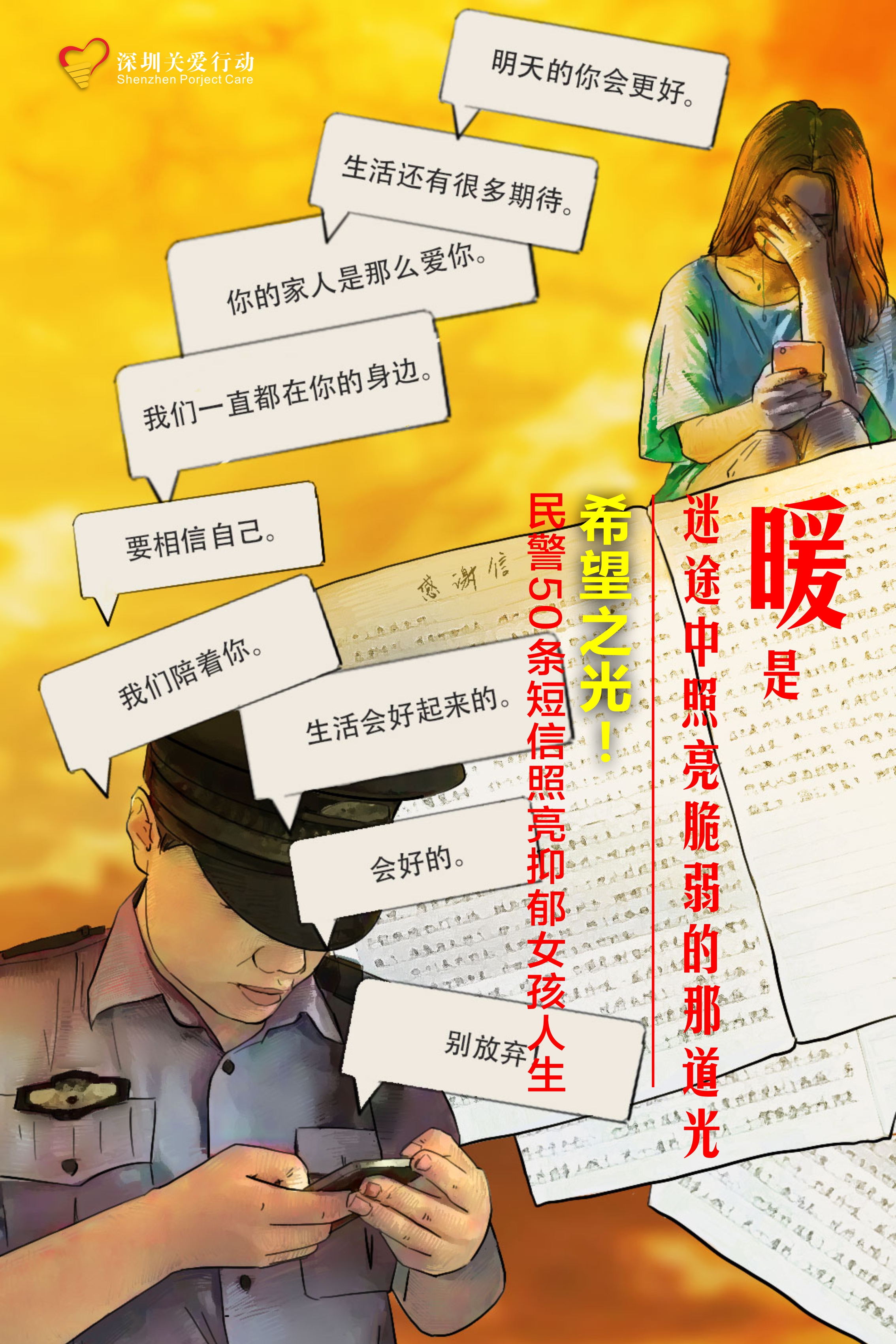 2021年9月,患上抑郁癥的女孩小艷,在自殺邊緣徘徊時被得知情況的深圳寶安上南派出所值班民警楊亮耐心的勸說拉了回來。此后,孤獨的女孩在治療過程中不時給楊亮發信息求助,楊亮耐心安慰、穩定她的情緒,一個多月的時間,50多條溫暖的短信,成為陪伴女孩度過治療期的那道“光”。之后重新燃起生活信心的她來到派出所,送來了錦旗和致謝信。