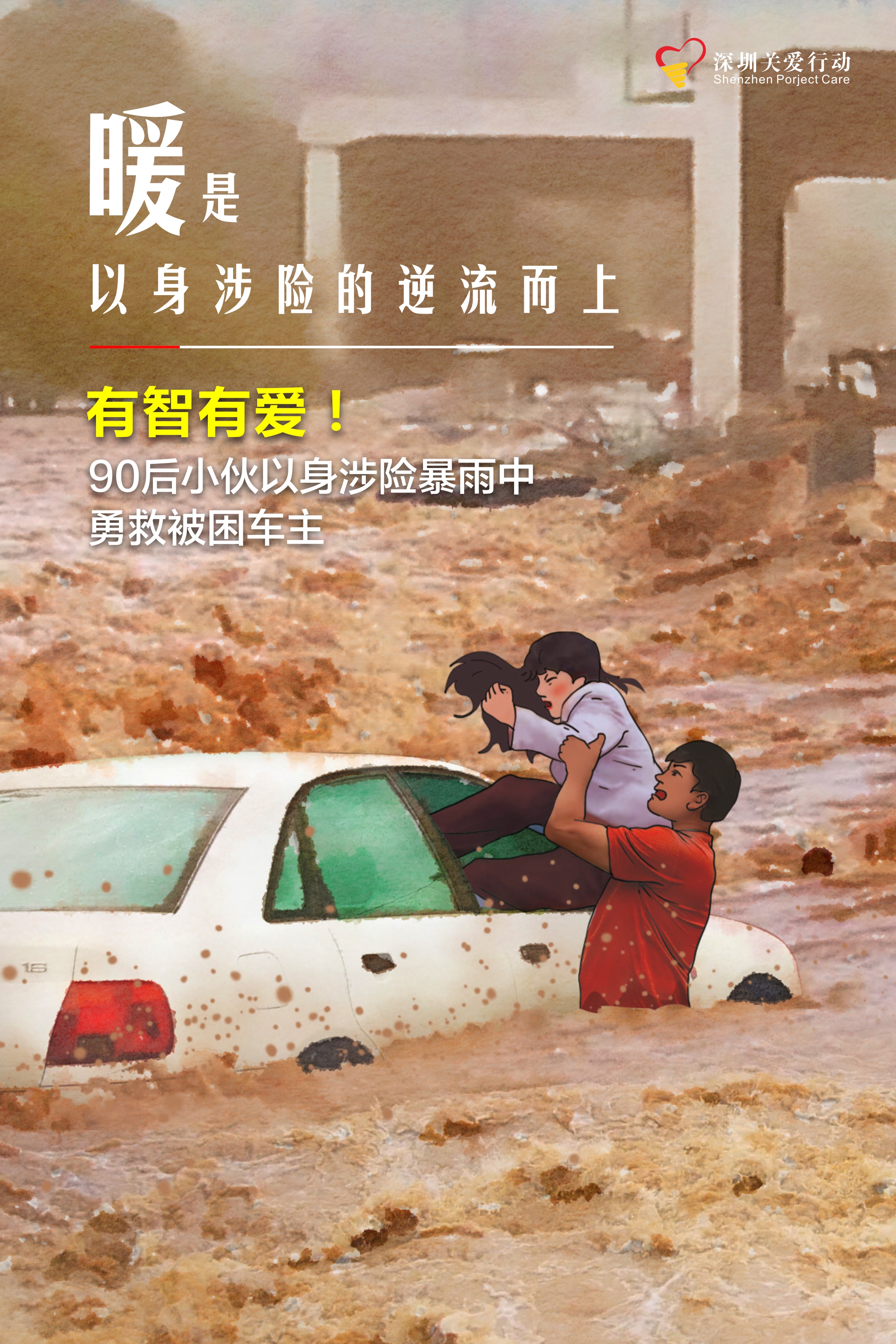 有智有愛!90后小伙以身涉險暴雨中勇救被困車主