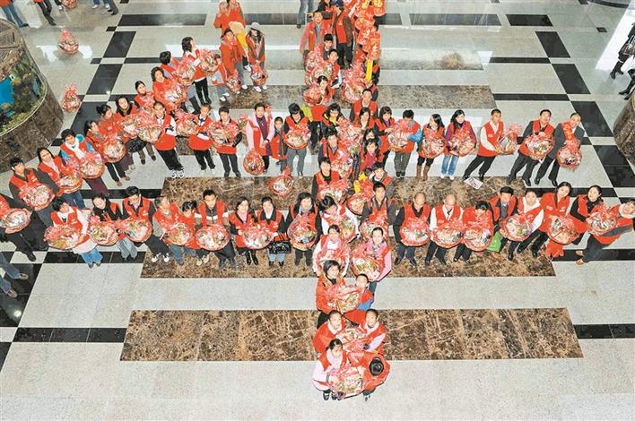 ▲2009年,愛心年夜飯出發儀式,志愿者擺出“牛”字造型。
