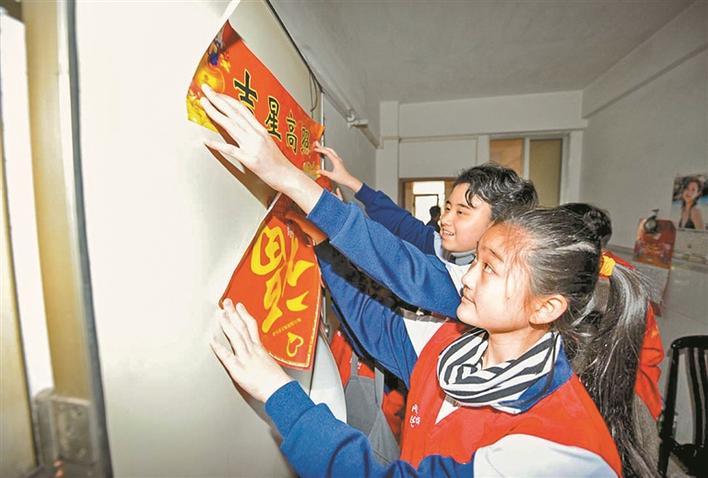 ▲參加愛心年夜飯活動的孩子們幫受助家庭貼春聯。