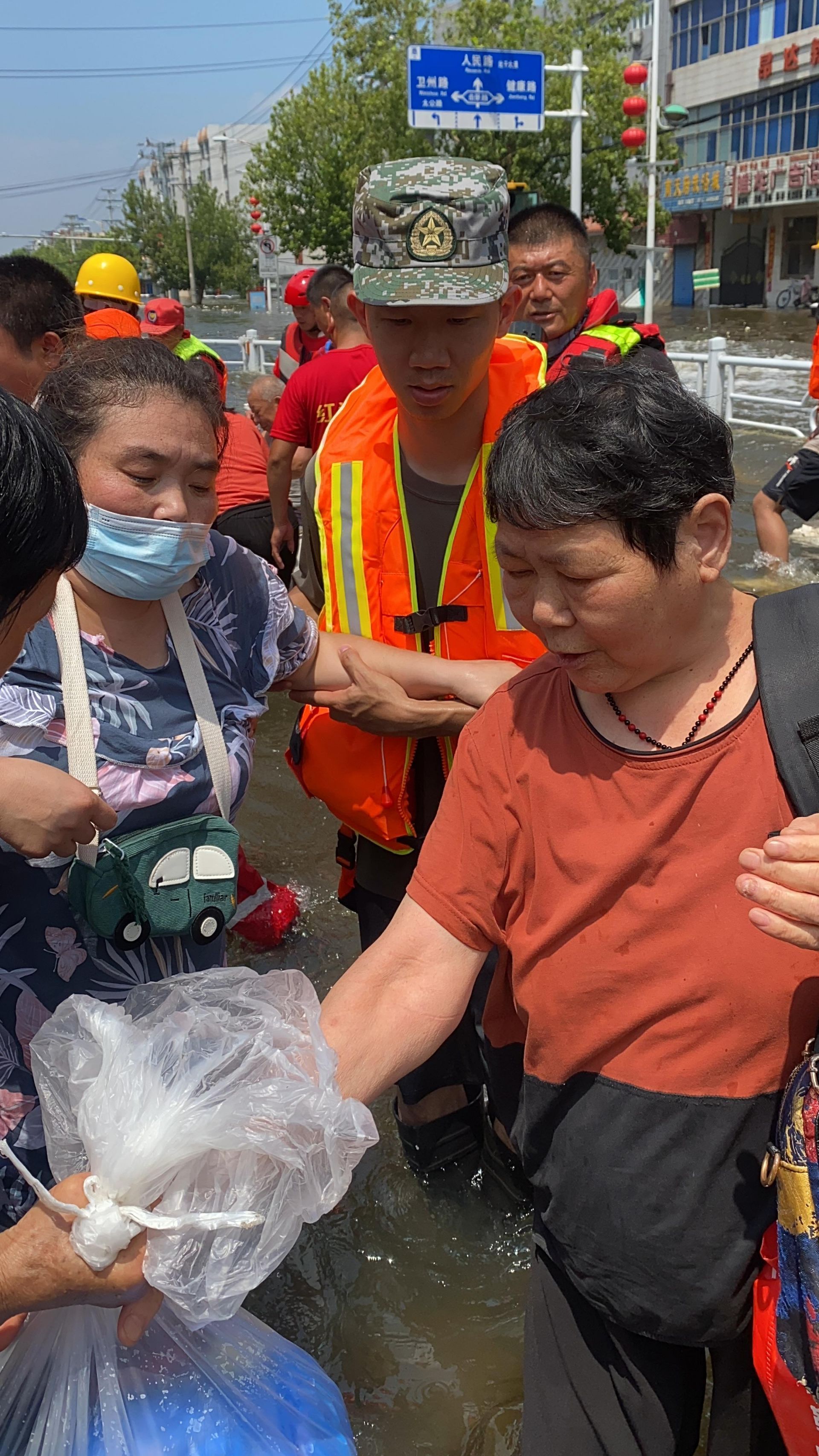 2021年7月16日,河南多地遭遇歷史罕見持續性強降雨。童穎聰看到新聞后,馬上搜集采購了救生衣、救生圈、手套、口罩、應急燈等便攜救援器材,裝了滿滿兩背囊,購買機票前往河南。“這是我第一次真正參與到一線救援當中去,出發時只有我一個人,但在路上偶遇了兩名退役軍人,我們一拍即合,臨時組建了一支老兵救援隊結伴同行。后來,又有一名空軍中校將30名救援人員和3條沖鋒舟交由我管理,我們便輾轉鄭州、新鄉衛輝、鶴壁浚縣多地全力救災。”