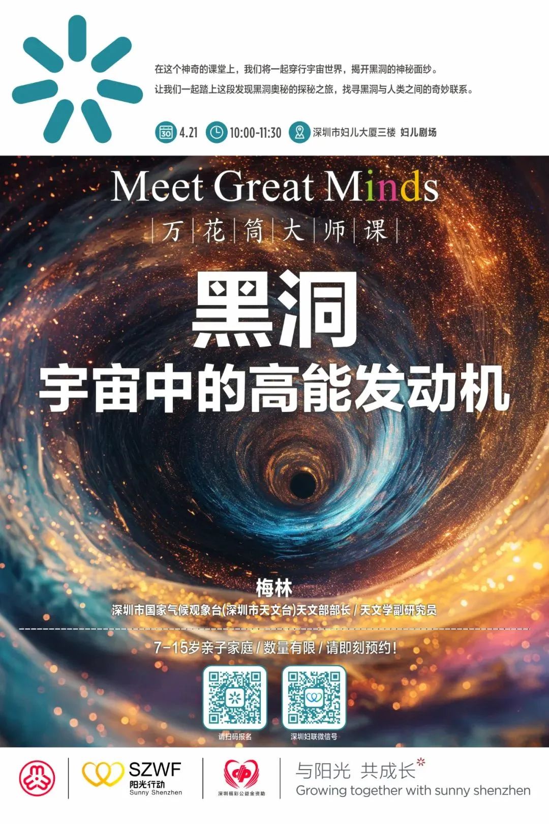 活動簡介:黑洞是什么?黑洞是如何形成的?本期萬花筒大師課,我們將一起穿行宇宙世界,探索黑洞奧秘,找尋黑洞與人類的奇妙聯系,揭開黑洞的神秘面紗。