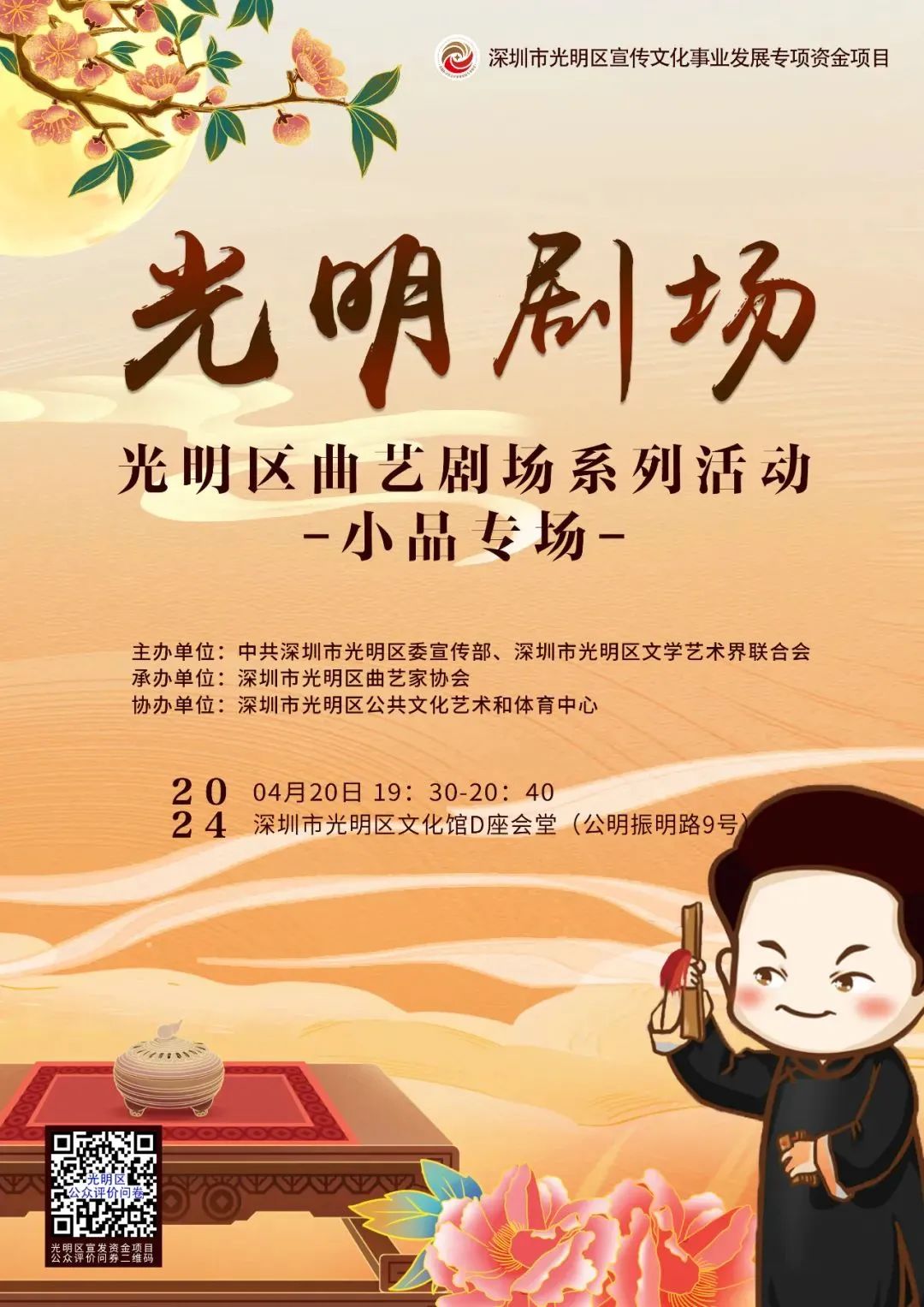 活動簡介:光明劇場——光明區曲藝劇場系列活動將于4月20日晚7:30在光明區文化館D座會堂精彩上演!在家門口觀賞曲藝盛宴的機會來了!搶票gogogo!本次活動由光明區宣傳文化事業發展專項資金資助,中共深圳市光明區委宣傳部、深圳市光明區文學藝術界聯合會主辦,深圳市光明區曲藝家協會承辦。